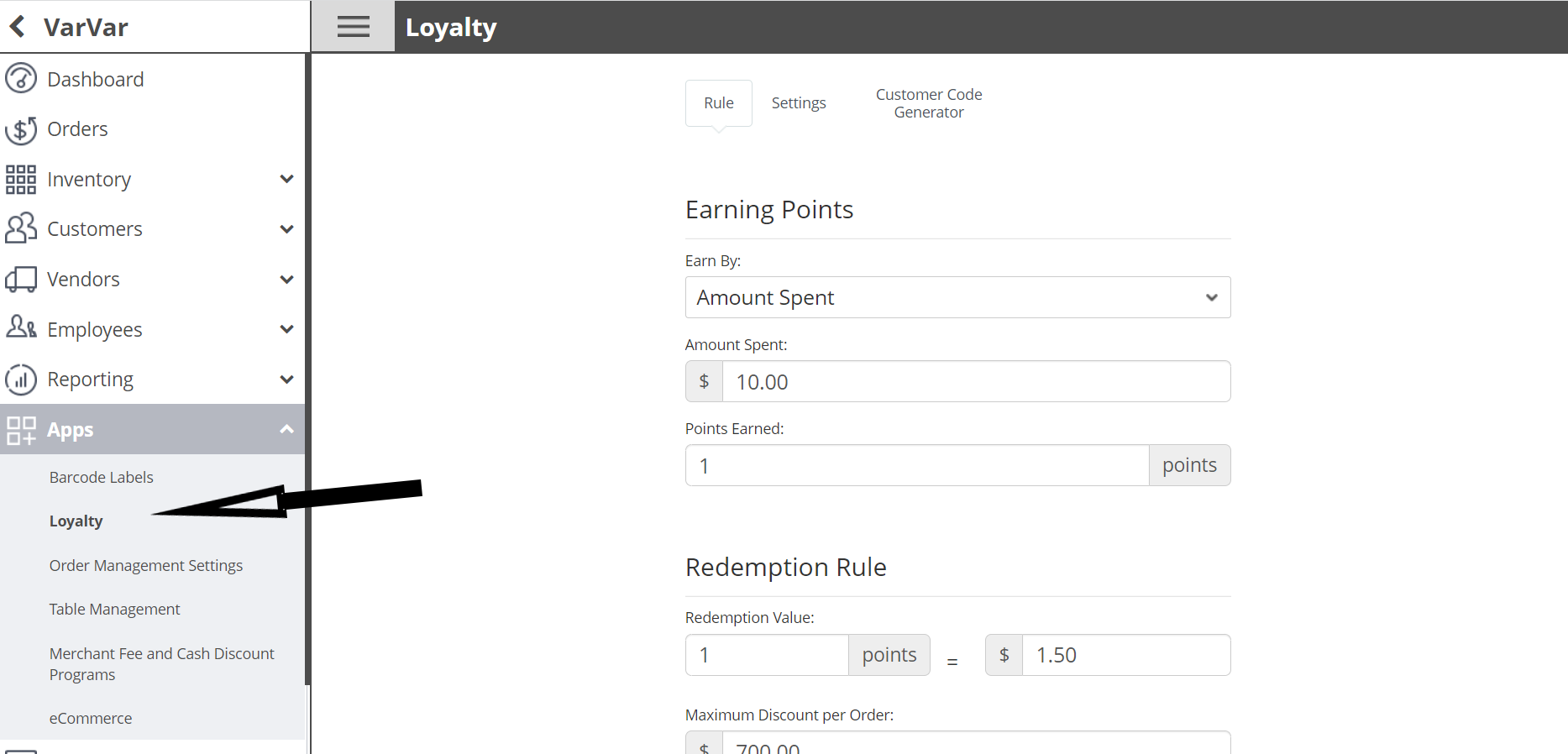 1. Select Apps--->Loyalty in the left navigation menu.