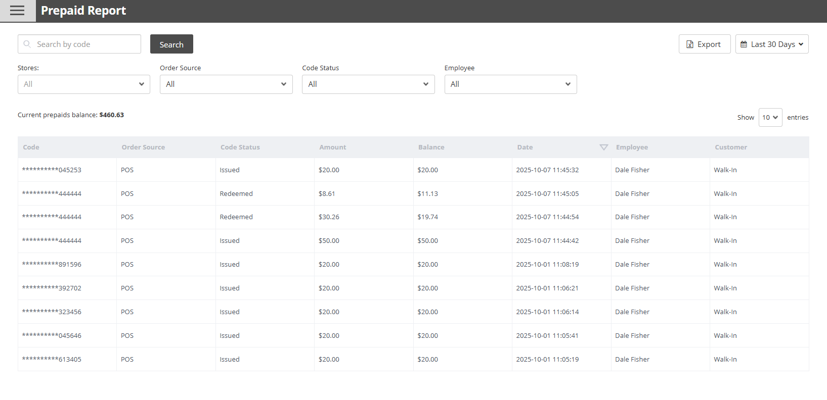 Go to Reporting → Prepaid Report: