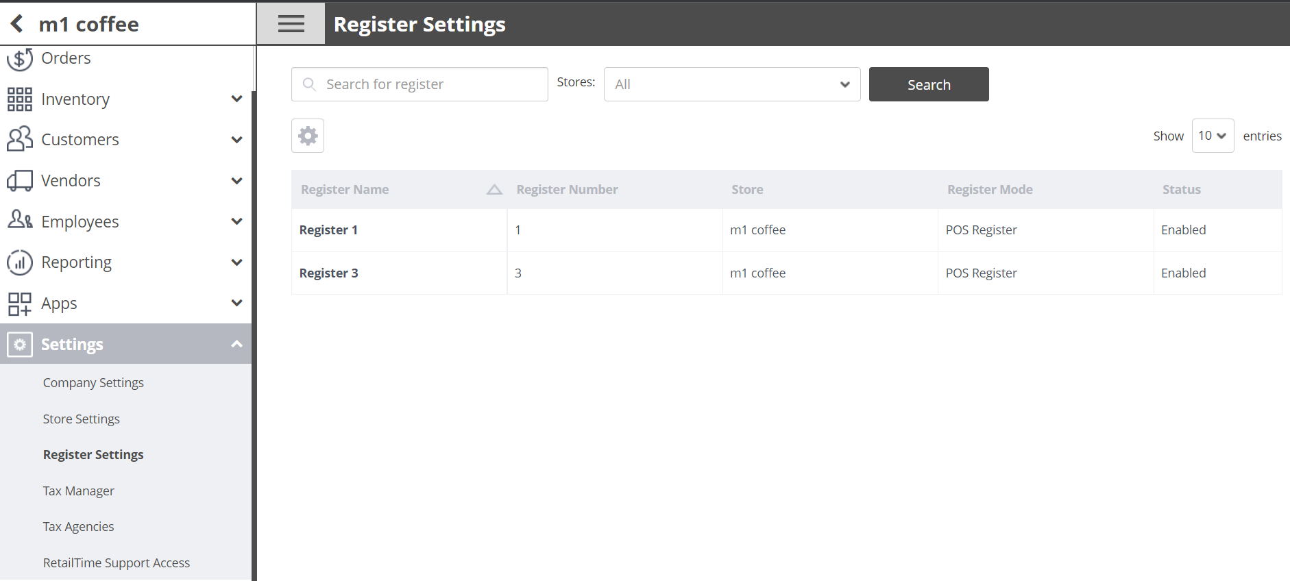 - For every register in the company, you can view the Register Name, Store the register is assigned to, and its Status as either Enabled or Disabled.