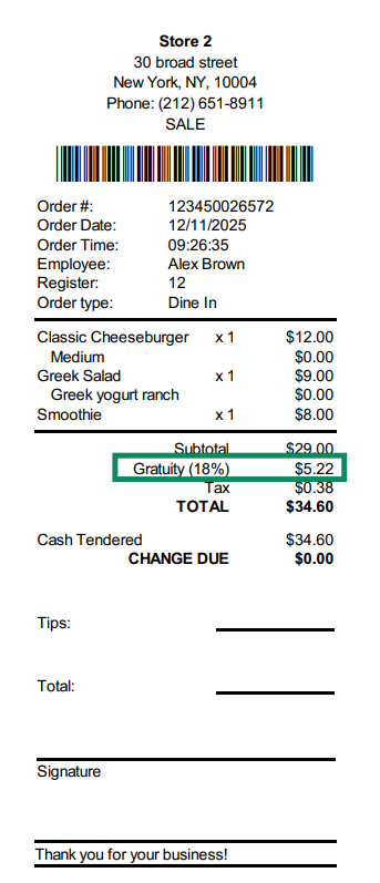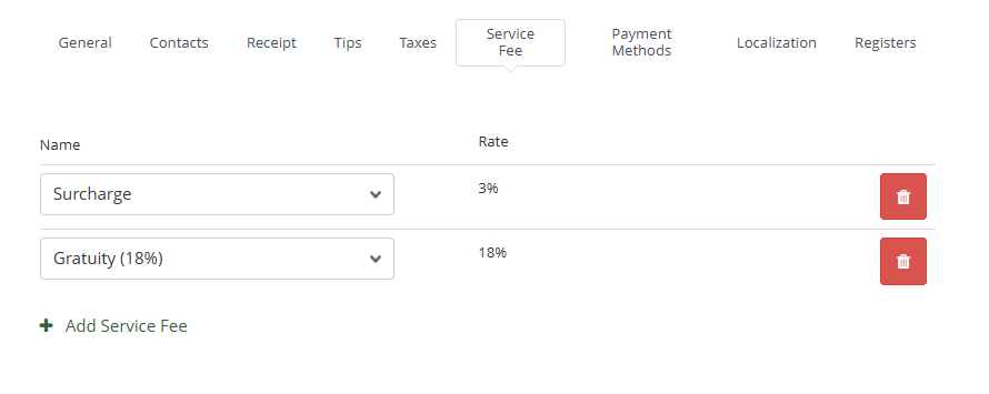 Field: Service Fee Name - Enter a clear, descriptive name - Example: "18% Gratuity", "Delivery Fee", "Kitchen Charge" - This name appears on receipts and reports