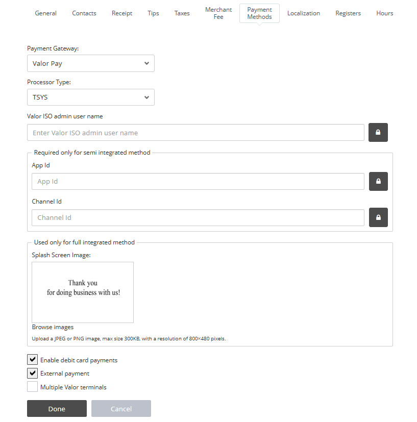 3. Click Payment Gateway tab--->select Valor in Payment Gateway drop-down menu > select your processor > enter ISO username > enter App ID --->click Done