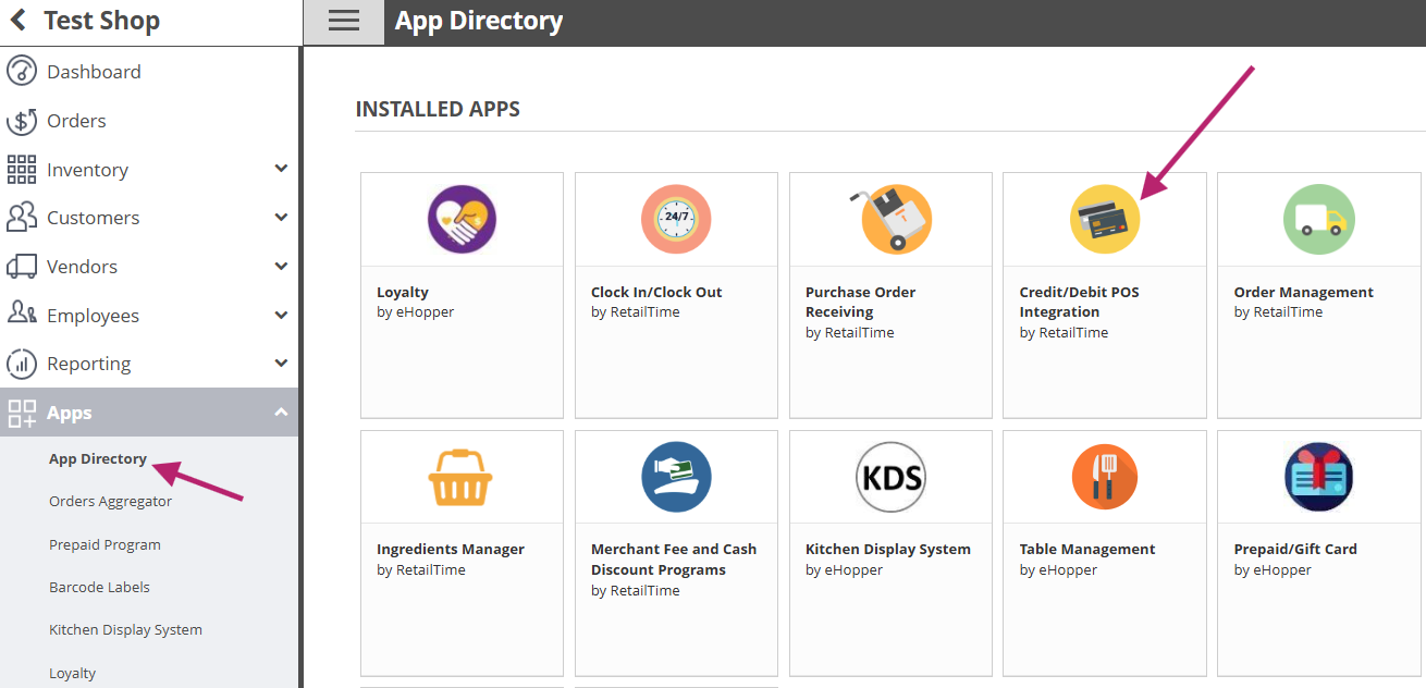 1. In Back Office, go to Settings--->Apps--->App Directory--->install Credit/Debit POS integration App